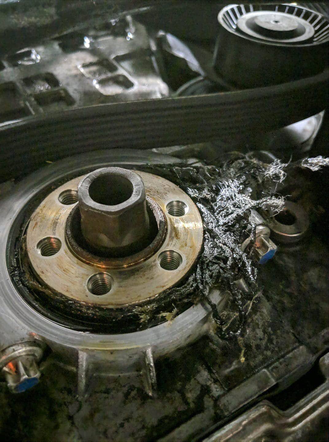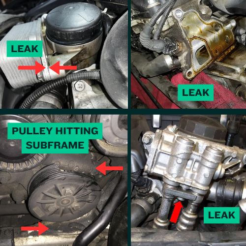 Due to the placement of their accessory belt beneath common leak areas in the N5x oil and coolant system. If a leak occurs, the accessory belt may begin to displace from the crank pulley. The engine's design allows small rubber fragments from the deteriorating belt to pass through the crank seal easily. These belt shards can then enter the timing chain, valve cover, or oil pickup, causing damage or engine oil starvation.