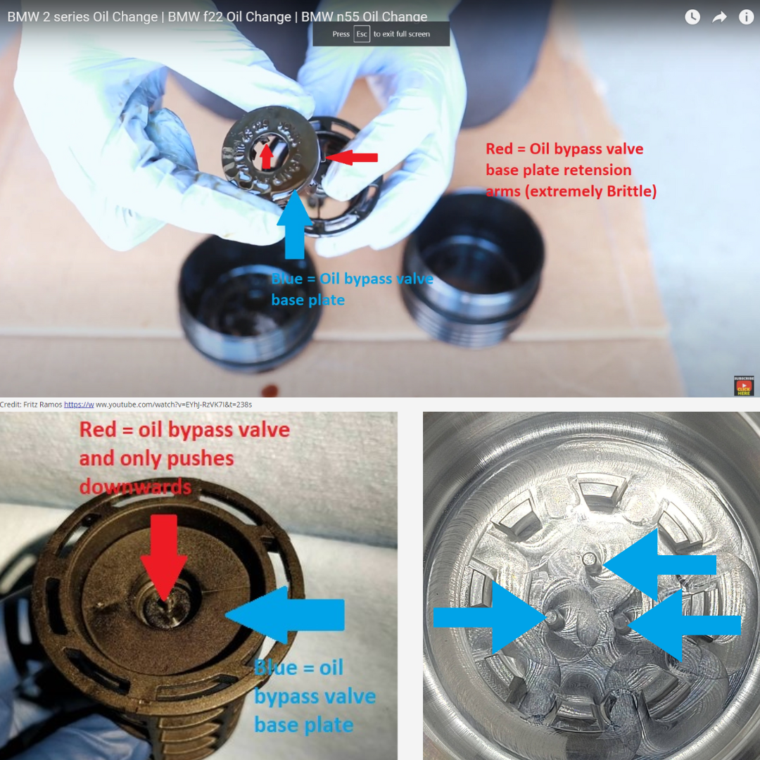The first image reveals the oil bypass base plate (blue arrow) being removed, exposing the birdcage internals. Note the small clips (red arrows) on the base plate, prone to brittleness and cracking over time due to heat cycles, weakening the assembly. This can lead to a loose base plate, risking a faulty seal and unfiltered oil bypass, causing engine wear. BMW's solution involves supporting tabs on the cap's interior, preventing base plate loosening even if clips fail. This design, also adopted by Malo at my request, addresses a common weakness overlooked by other companies.
